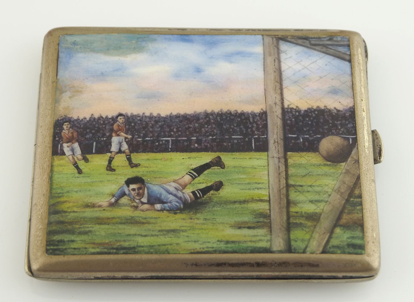 Scatoletta portasigarette decorata con scena calcistica a smalti policromi....