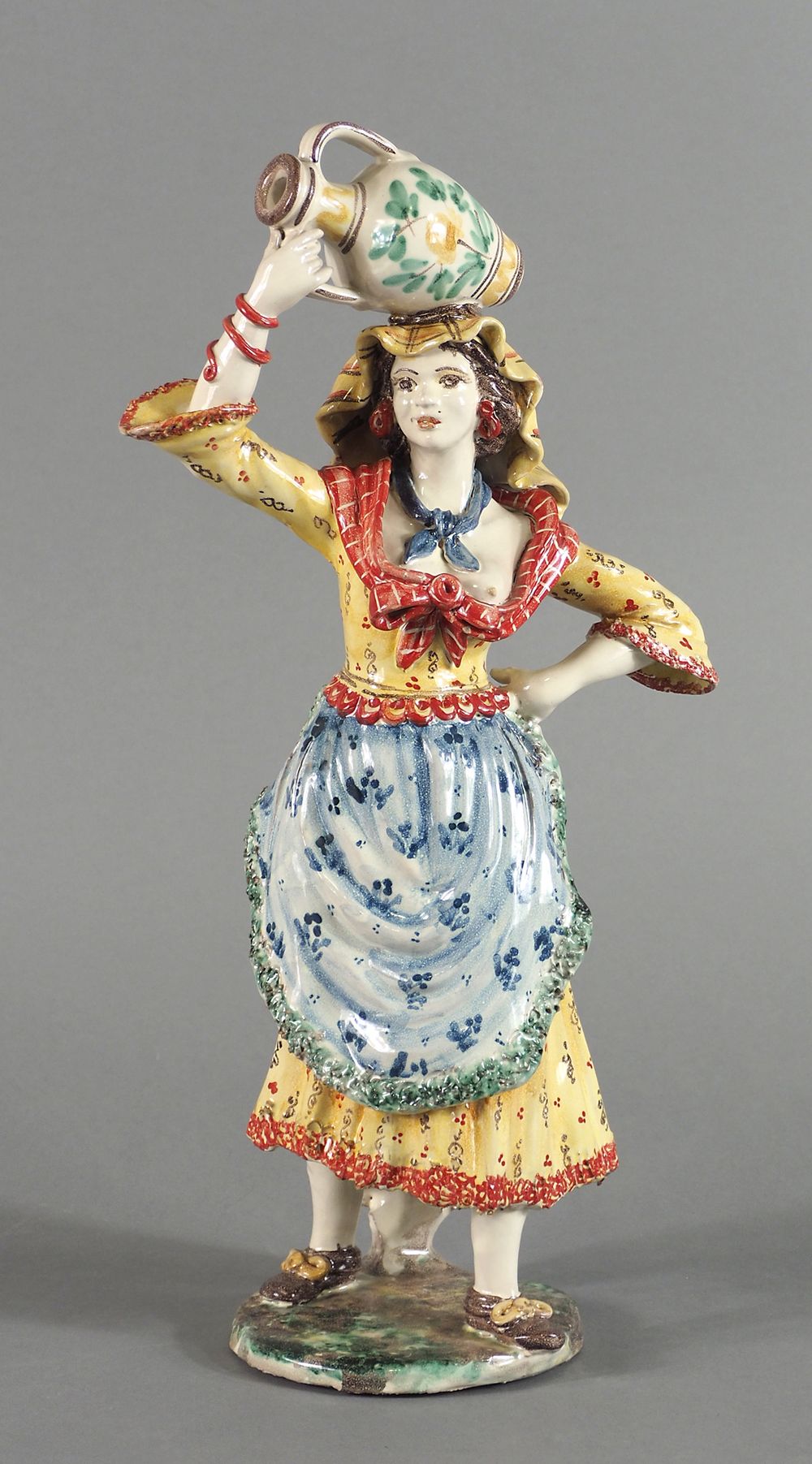 Scultura in ceramica policroma raffigurante portatrice d'acqua. H. cm. 37,5.