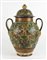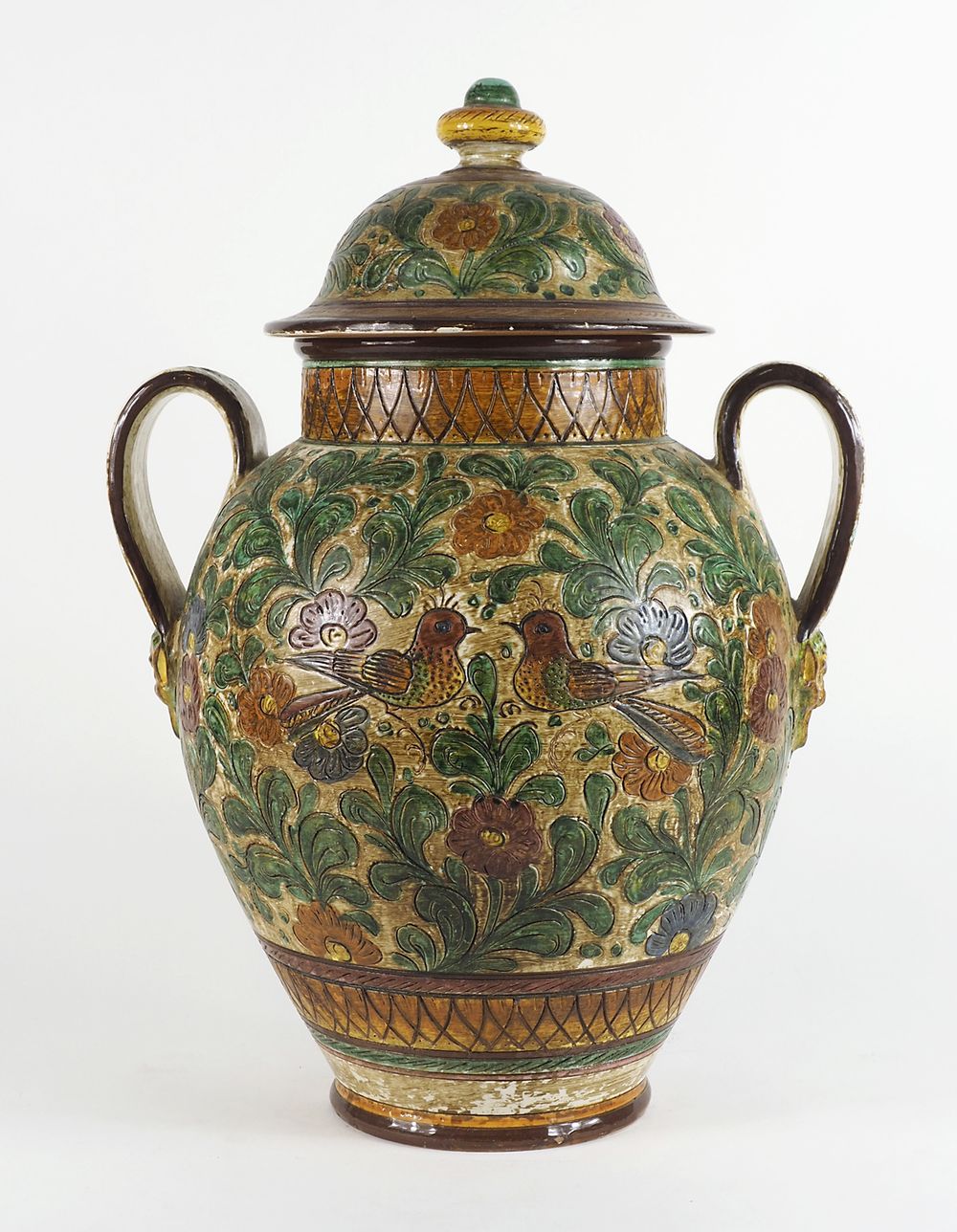 Grande vaso in ceramica policroma con coperchio e manici laterali. H. tot cm. 51. (sbeccature).