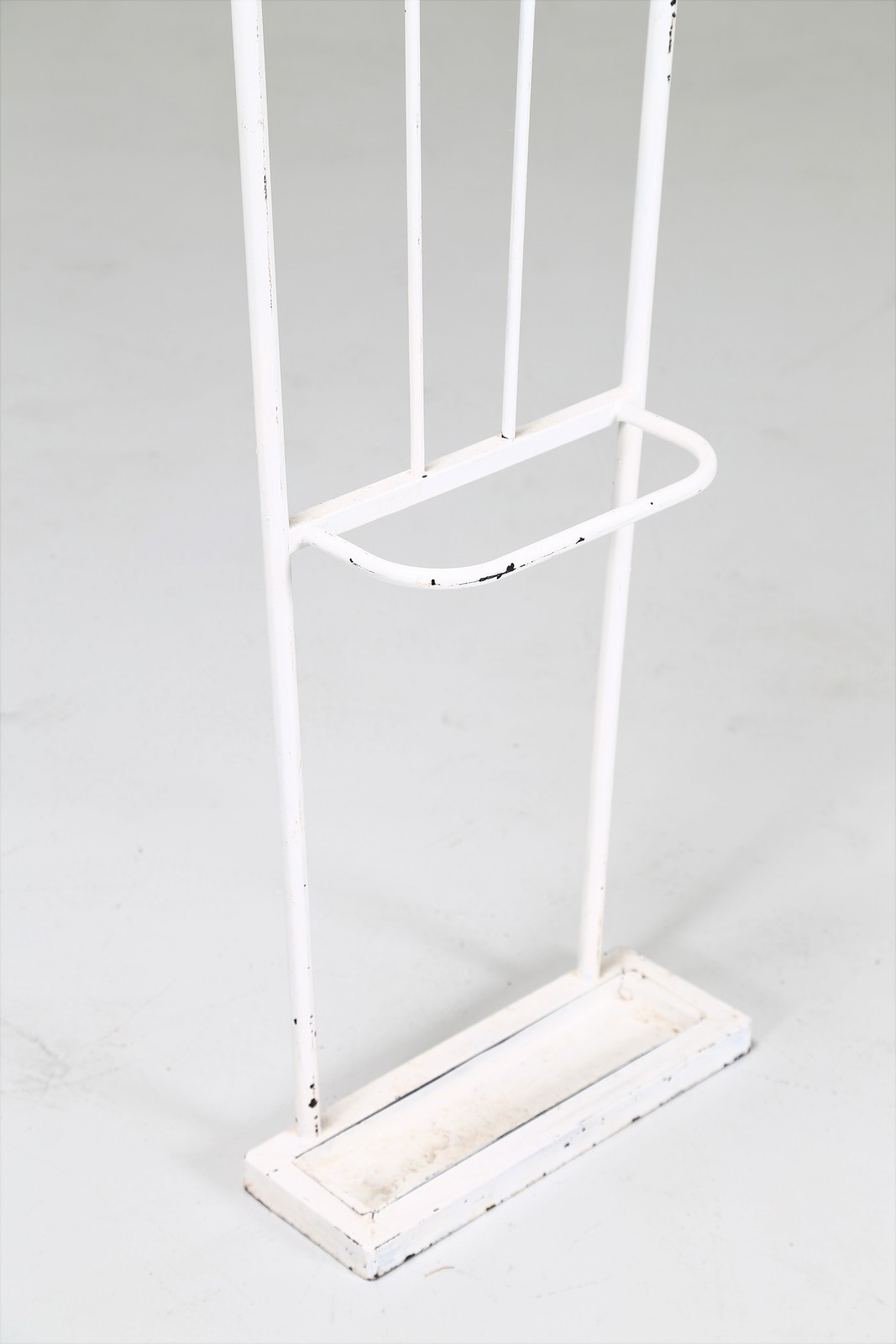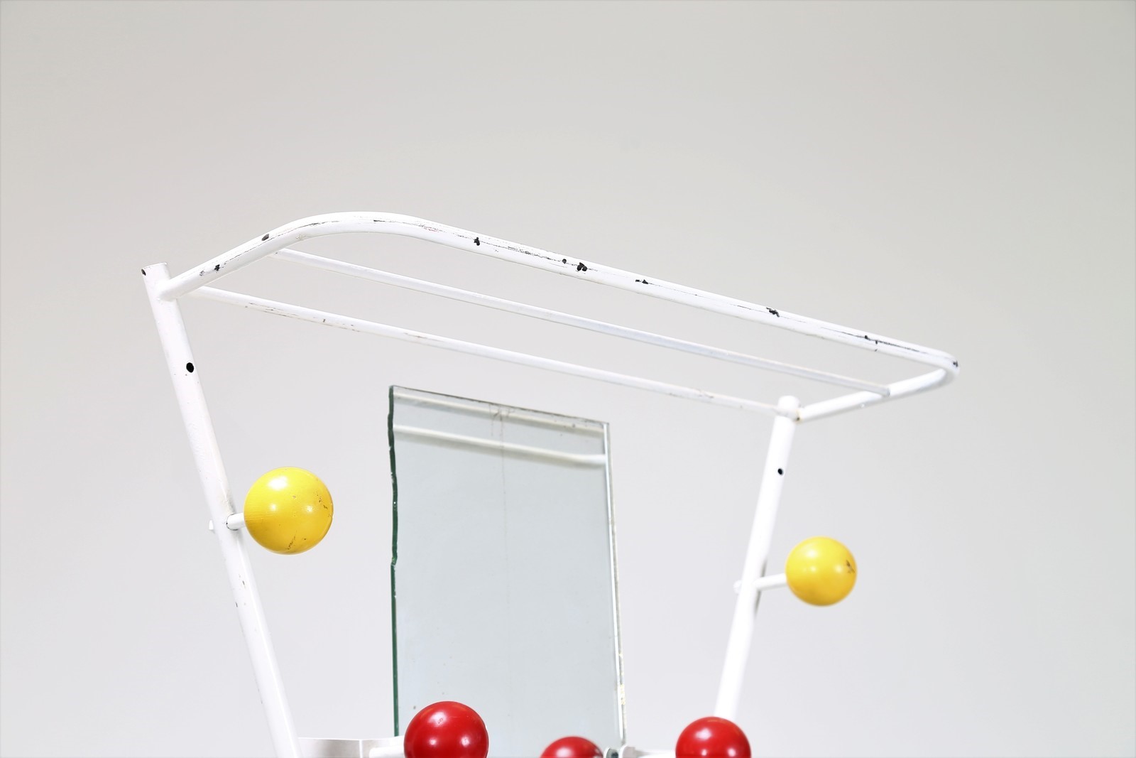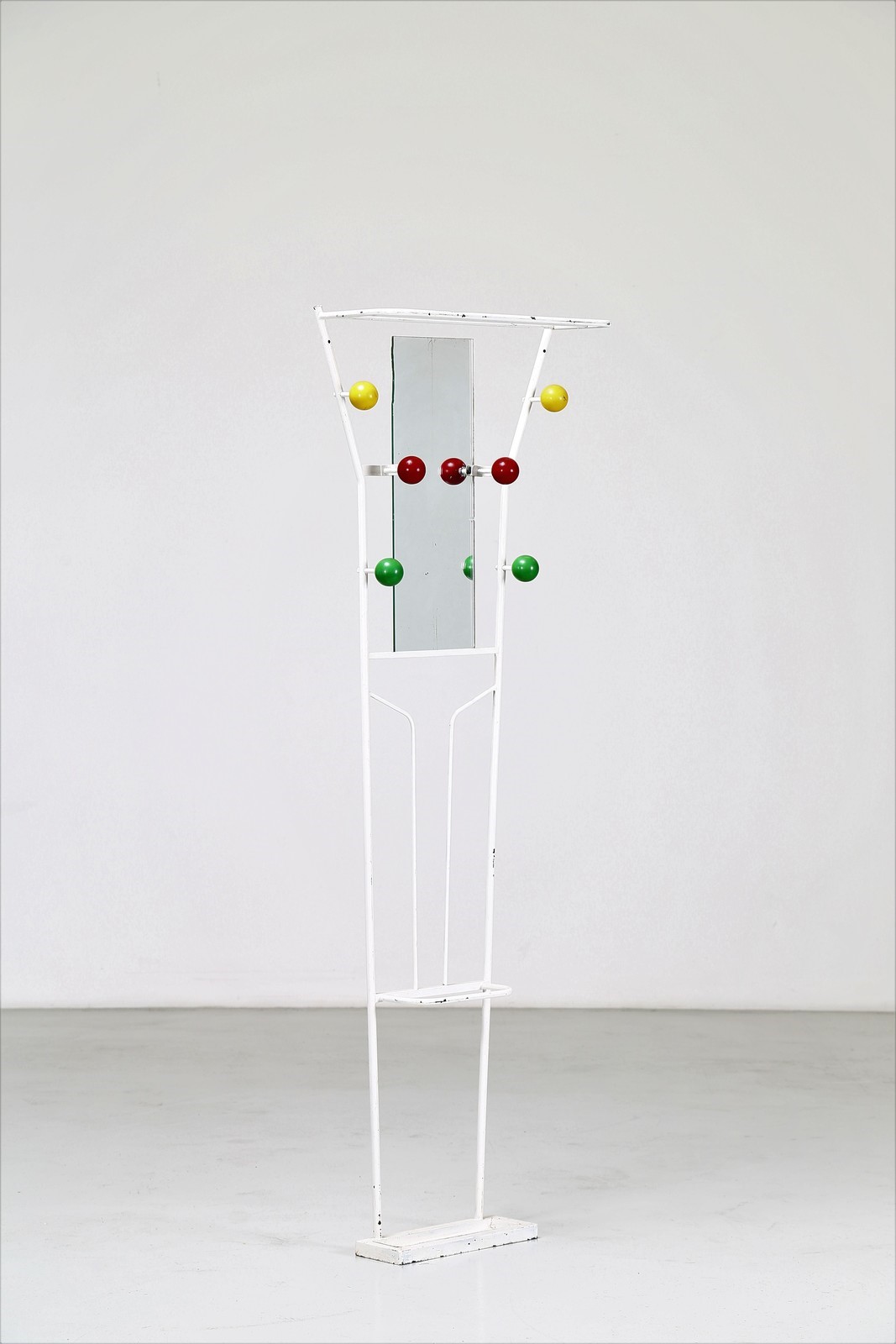 MANIFATTURA ITALIANA Attaccapanni in metallo laccato, vetro e legno laccato, anni 60 . -. Cm 61,00 x 176,00 x 20,00. (vetro scheggiato)