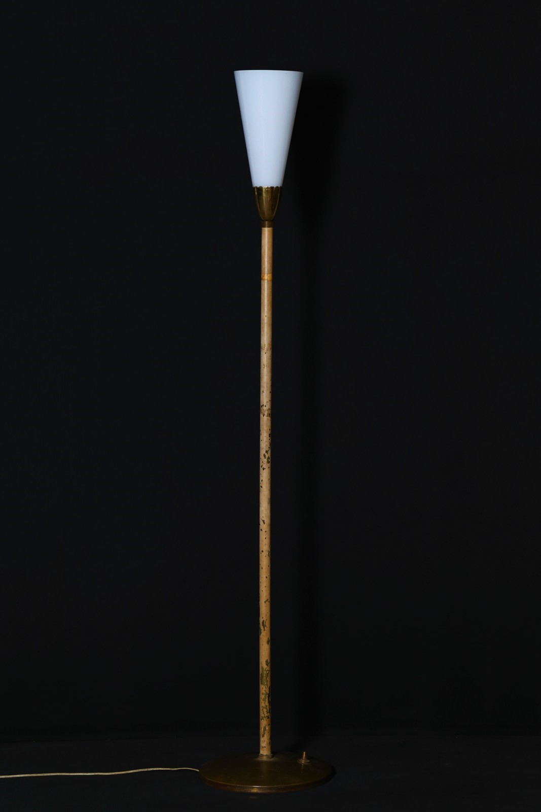 ARREDOLUCE Attrib. Lampada da terra anni 50. -. Cm 34,00 x 164,00 x 34,00. Metallo laccato, ottone e vetro opalino