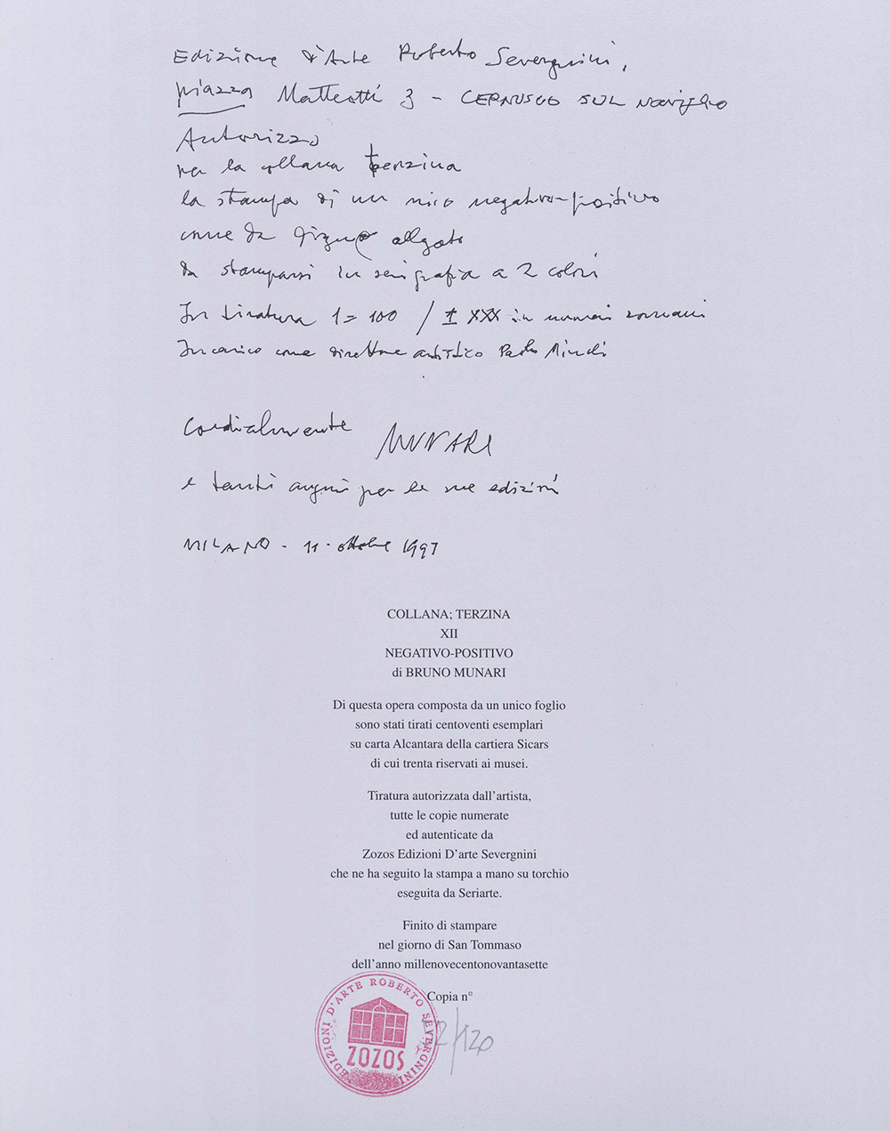 L'opera è accompagnata da certificato di autenticità a cura di Zozos Edizioni d'Arte Severgnini