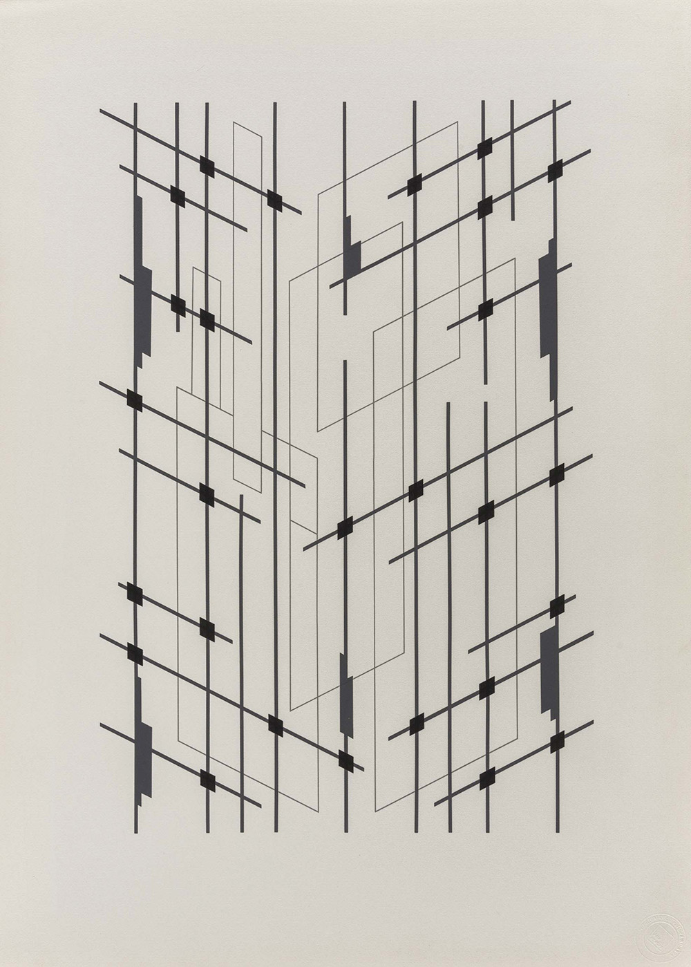 Serigrafia, es. 28/100, edita per la cartella 'Tre tempi visivi di una interstruttura: Aldo Galli', Edizioni di Arte Struktura, Milano, 1981