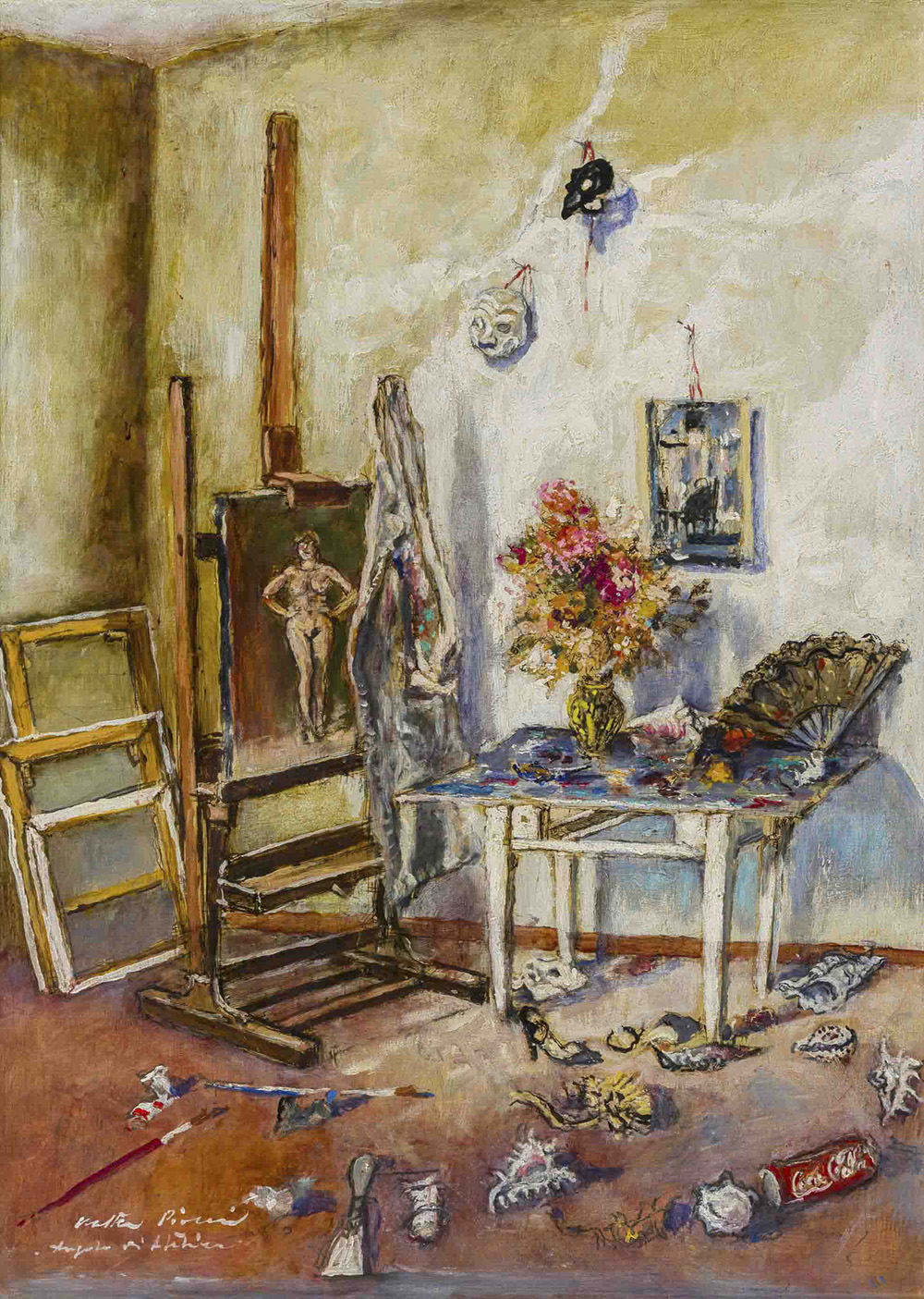 WALTER PIACESI (1929) Angolo di atelier con varie cose Olio su tavola 70 x 50...