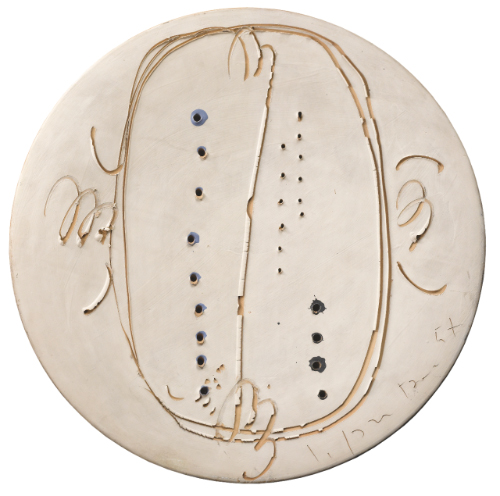 LUCIO FONTANA 1899 - 1968 CONCETTO SPAZIALE signed and dated 57, coloured terracotta, holes and graffiti firmato e datato 57 piatto in terracotta colorata con buchi e graffiti diametro cm 47 Opera registrata presso la Fondazione Lucio Fontana, con il n. 2531/1 (ex. n. 953/9)