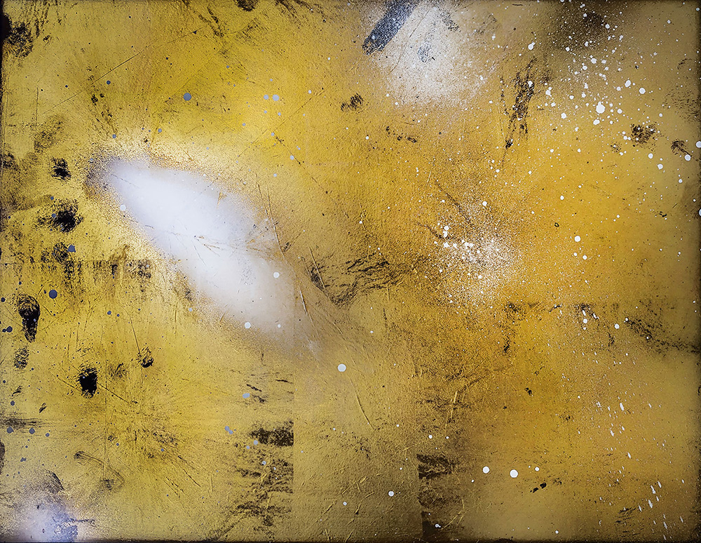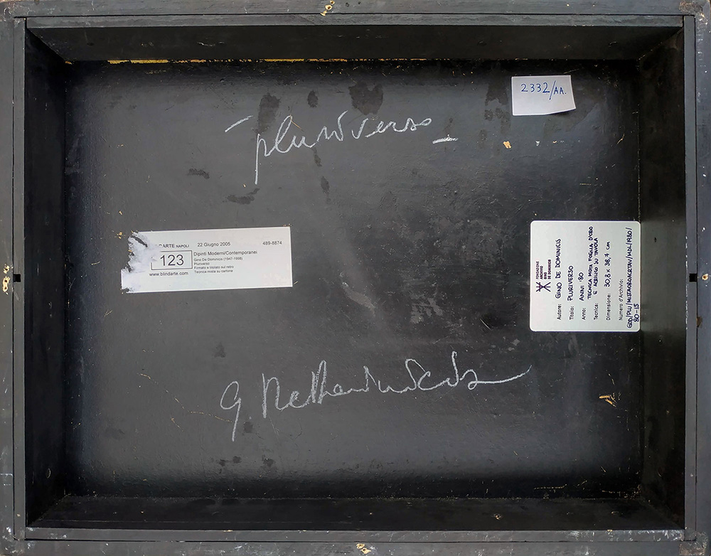 Gino De Dominicis, Pluriverso, anni '80 Tecnica mista foglia d'oro e acrilico su tavola, 30,8x38,7 cm Firma e titolo a retro Dichiarazione d'autenticità a cura dell'archivio Gino De Dominicis a firma del presidente Vittorio Sgarbi e della vice presidente Marta Massaioli Numero d'archivio GDD/Plu/MistaOroAcrTav/MDL/1980/80-15 Provenienza collezione privata Venezia; asta BlindArte (NA); Claudio Poleschi (LU)