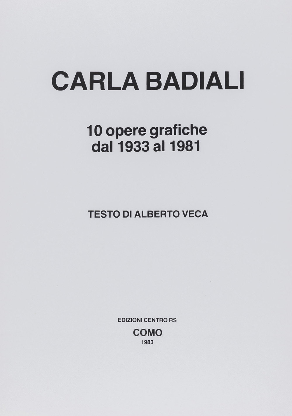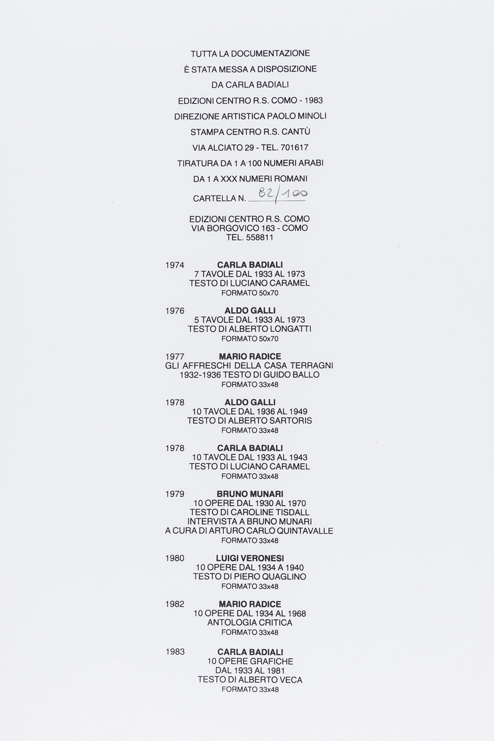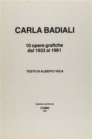 Carla Badiali 1907 - 1992 Carla Badiali - 1983 tecnica Cartella contenente 10 opere grafiche dal 1933 al 1981 Dimensioni cm. 48 x 33 Firma Firmato Note con testo a cura di Alberto Veca Edizioni Centro RS Como Tiratura 1-100 numeri arabi - I-XXX numeri romani Opera n. 82/100 Provenienza Collezione Privata