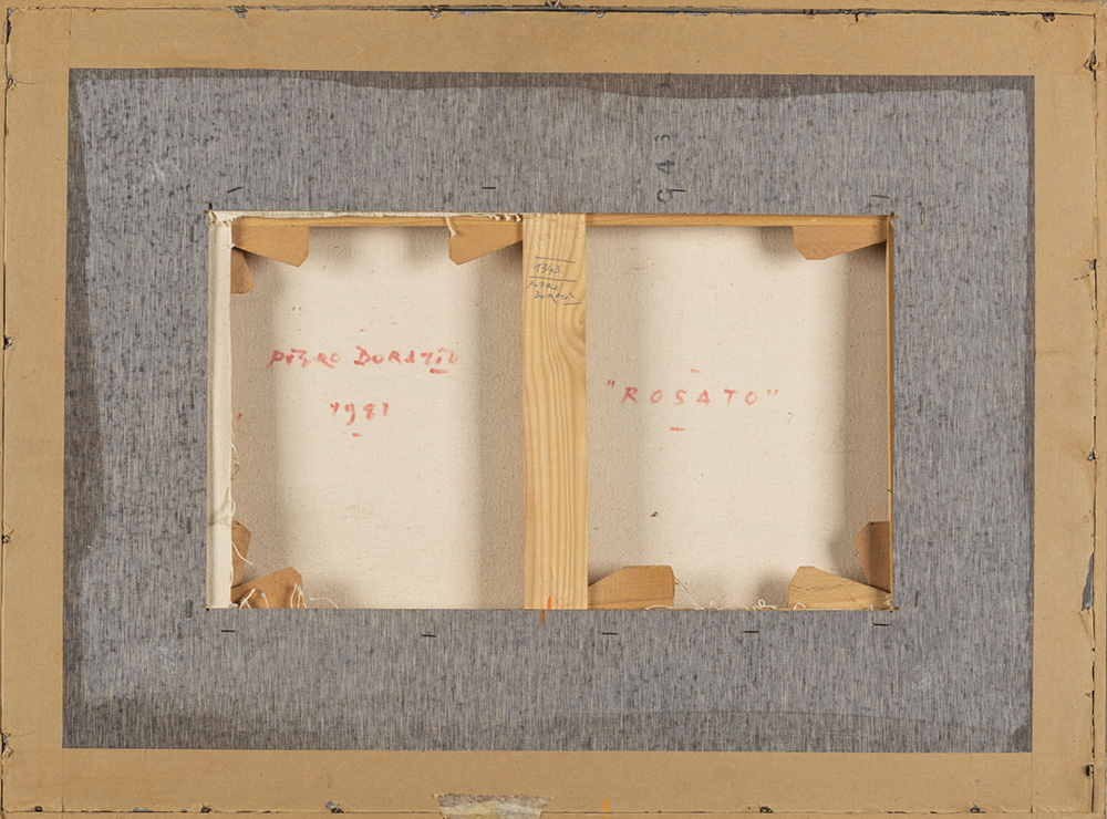 Piero Dorazio 1927 - 2005 Rosato - 1981 tecnica Olio su tela Dimensioni cm. 35 x 55 Firma Firmato e datato sul retro Documenti Certificato di Autenticità a cura dell'Archivio Opera Piero Dorazio, Todi Provenienza Collezione Privata