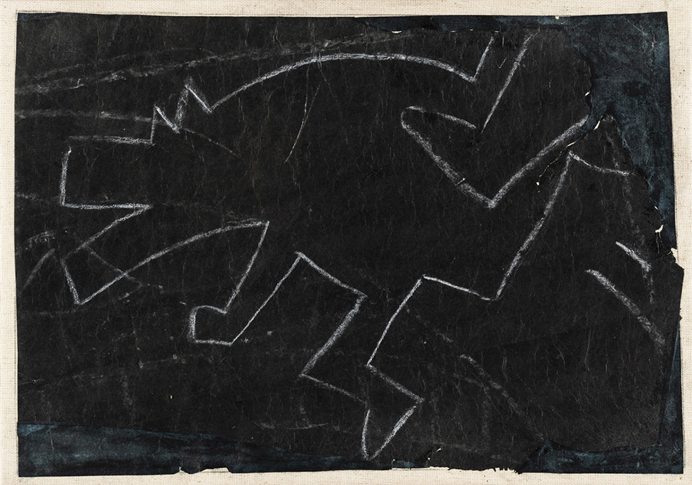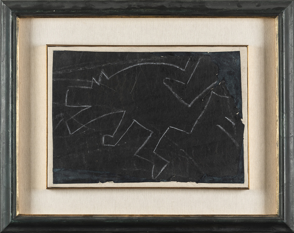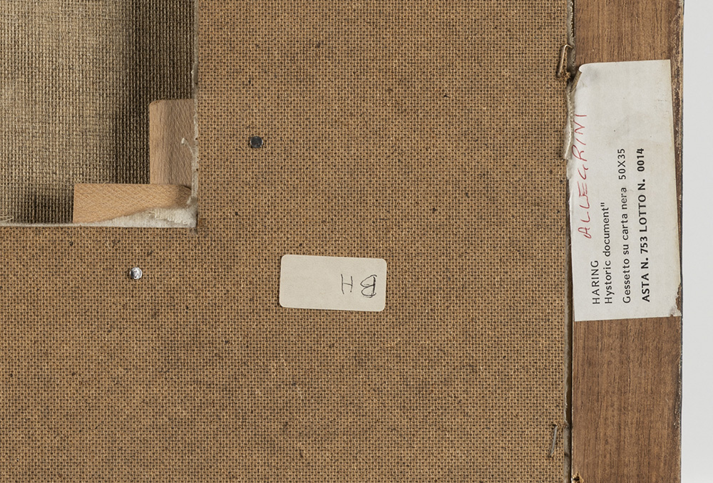 Lotto 237 Keith Haring 1958 - 1990 Senza titolo (Frammento storico di street-art dalla metropolitana di New York) - 1981-82 tecnica Gesso su carta nera, strappata dal muro, riportata su tela Dimensioni cm. 35 x 50 Documenti Opera non archiviata perché delocalizzata dal luogo originario, come dichiarazione della Fondazione Keith Haring Certificato di Provenienza di Paolo Buggiani su fotografia Provenienza Paolo Buggiani, New York Asta Finarte 23 ottobre 1990 Collezione Privata Pubblicazioni “Keith Haring - Subway Drawings e la New York Street Art”, Edizioni Gabriele Mazzotta, Milano, 1997, p. 37 “Avanguardie del XX secolo”, Catalogo Asta 753, Finarte Casa d’Aste, asta del 23 ottobre 1990, p.8-9