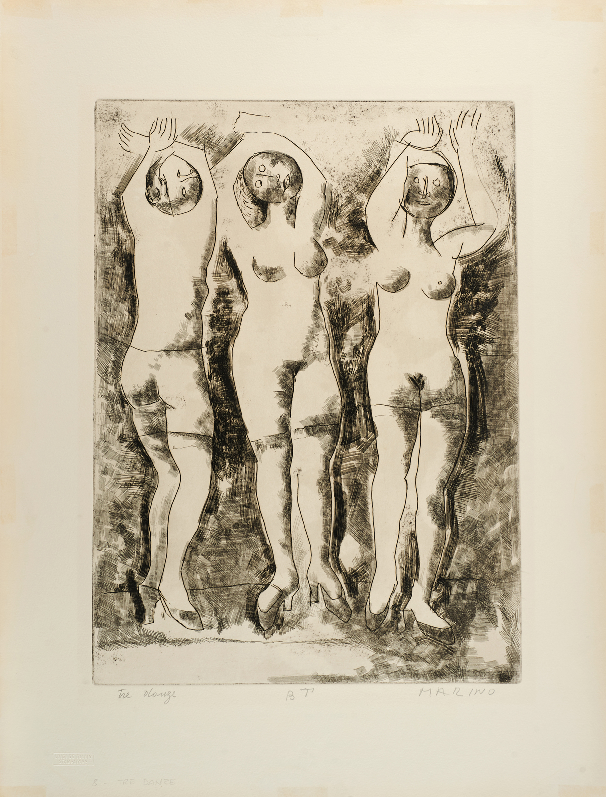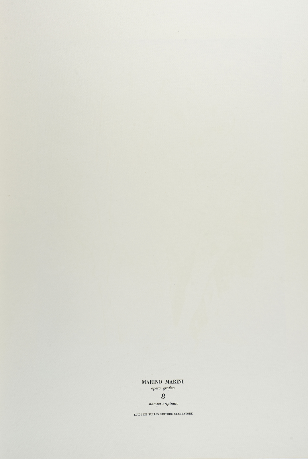 MARINI MARINO (1901 - 1980) Three dances. 1968. Etching. Cm 50,50 x 69,50. Title and signature lower in pencil. Luigi De Tullio printer stamp lower left. Arches france filigree. Plate size: 47.5 x 34 cm. Publications: Marino Marini twenty etchings, San Lorenzo Gallery, Florence, 26 April - 18 May 1975. Tribute to Marino Marini, thirty two graphics made from 1959 to 1972, Poggiali e Forconi Gallery, 25 October - 30 November 1986, Florence.