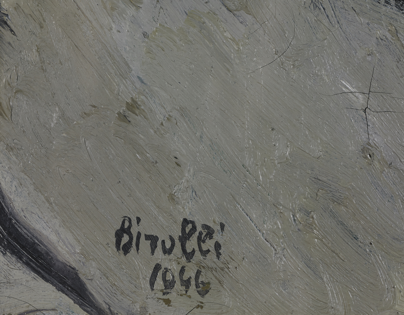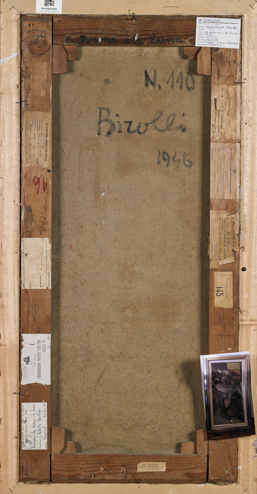 BIROLLI RENATO (1905 - 1959) Donna e la luna. . 1946. Olio su tela . Cm 68,00 x 120,00. Firma e anno in basso a sinistra. Al retro firma e anno. Cartiglio descrittivo Galleria d'Arte Moderna e Contemporanea Palazzo Forti, Verona. Provenienza: Collezione privata Giampaolo Palazzani. Collezione privata Brescia. Esposizioni: XXVI Esposizione Biennale Internazionale d'Arte, Venezia 1952. La figura nell'arte italiana contemporanea, giugno 1961, Galleria La Bussola, Torino. Collezione: G. Achille Cavellini, Brescia. XXX Biennale Internazionale d'Arte di Venezia, 1960. Pittori moderni Collezione Cavellini, Galleria Nazionale d'Arte Moderna, Maggio-Lluglio 1957. . Cornice presente