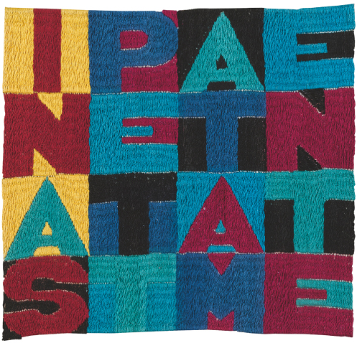 ALIGHIERO BOETTI 1940 - 1994 INASPETTATAMENTE signed and dated 1987 on the reverse, tapestry firmato e datato 1987 sul risvolto arazzo cm 16,5x18 Opera registrata presso l'Archivio Alighiero Boetti, Roma, con il n. 6893 L'opera è accompagnata da certificato su fotografia rilasciato dall'Archivio Alighiero Boetti, Roma PROVENANCE Collezione Michelagnoli, Venezia Ivi acquisito dall'attuale proprietario