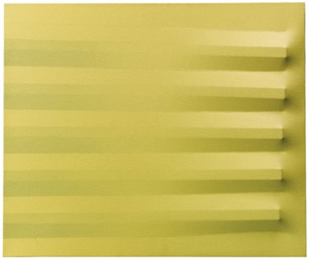 AGOSTINO BONALUMI N. 1935 GIALLO signed on the reverse, shaped canvas and enamel. Executed in 1973 firmato sul retro tela estroflessa e smalto cm 45x55 Eseguito nel 1973 Opera registrata presso l'Archivio Bonalumi, Milano, con il n. 73-005 L'opera è accompagnata da certificato su fotografia rilasciato dall'Archivio Bonalumi, Milano