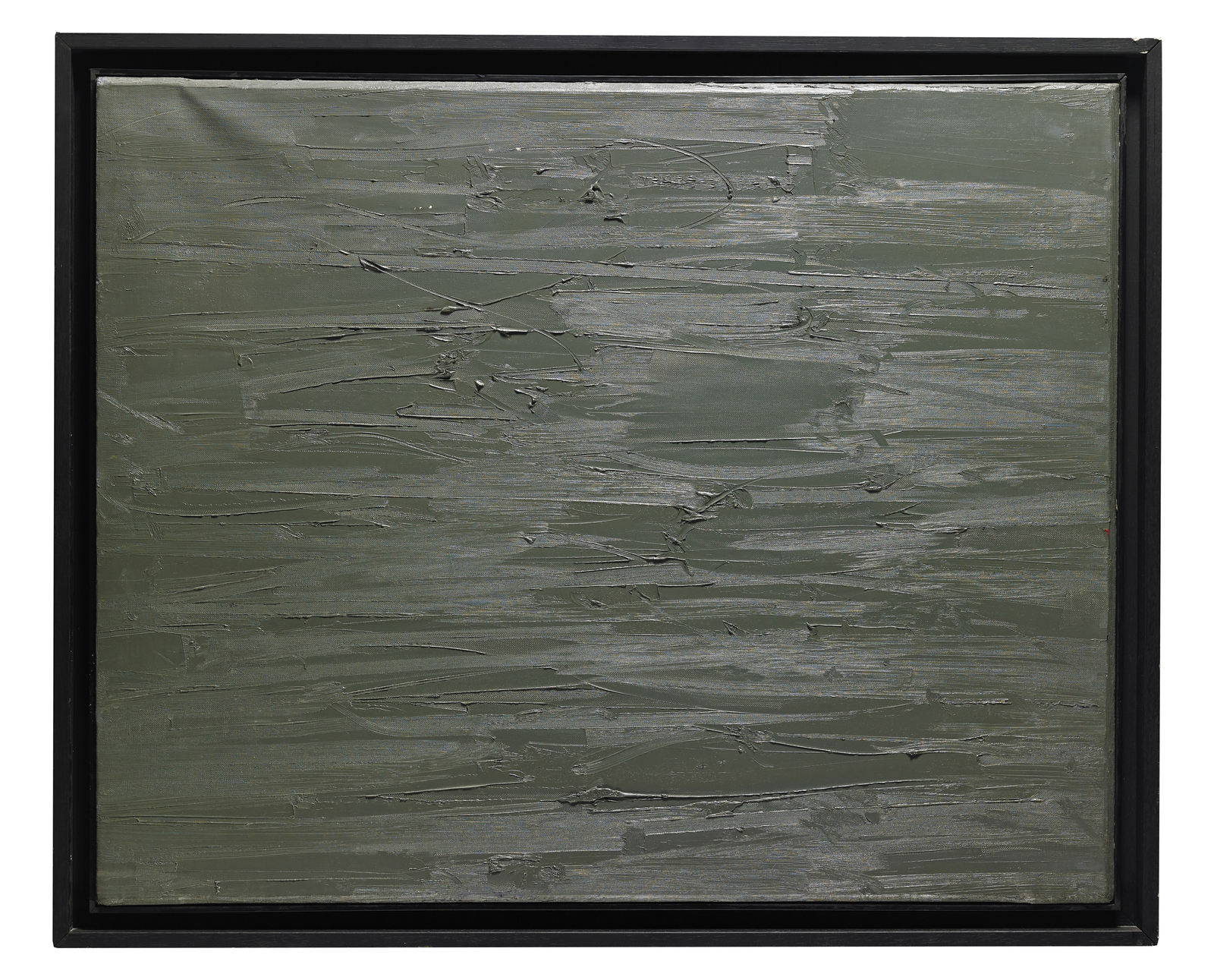 RUGGERI PIERO (1930 - 2009) Untitled (Placca trasversale grigia). 1987. Oil on canvas . Cm 93,00 x 75,00. At the back title, signature and year. Exhibition: Piero Ruggeri, 16 July - 12 Sptember 1993, Acqui Terme. Publication: Rubberi by Elisabetta Longari, Bottega d'Arte Gallery, Acqui Terme, May - June 1989, pag. 18 -19. Cornice presente