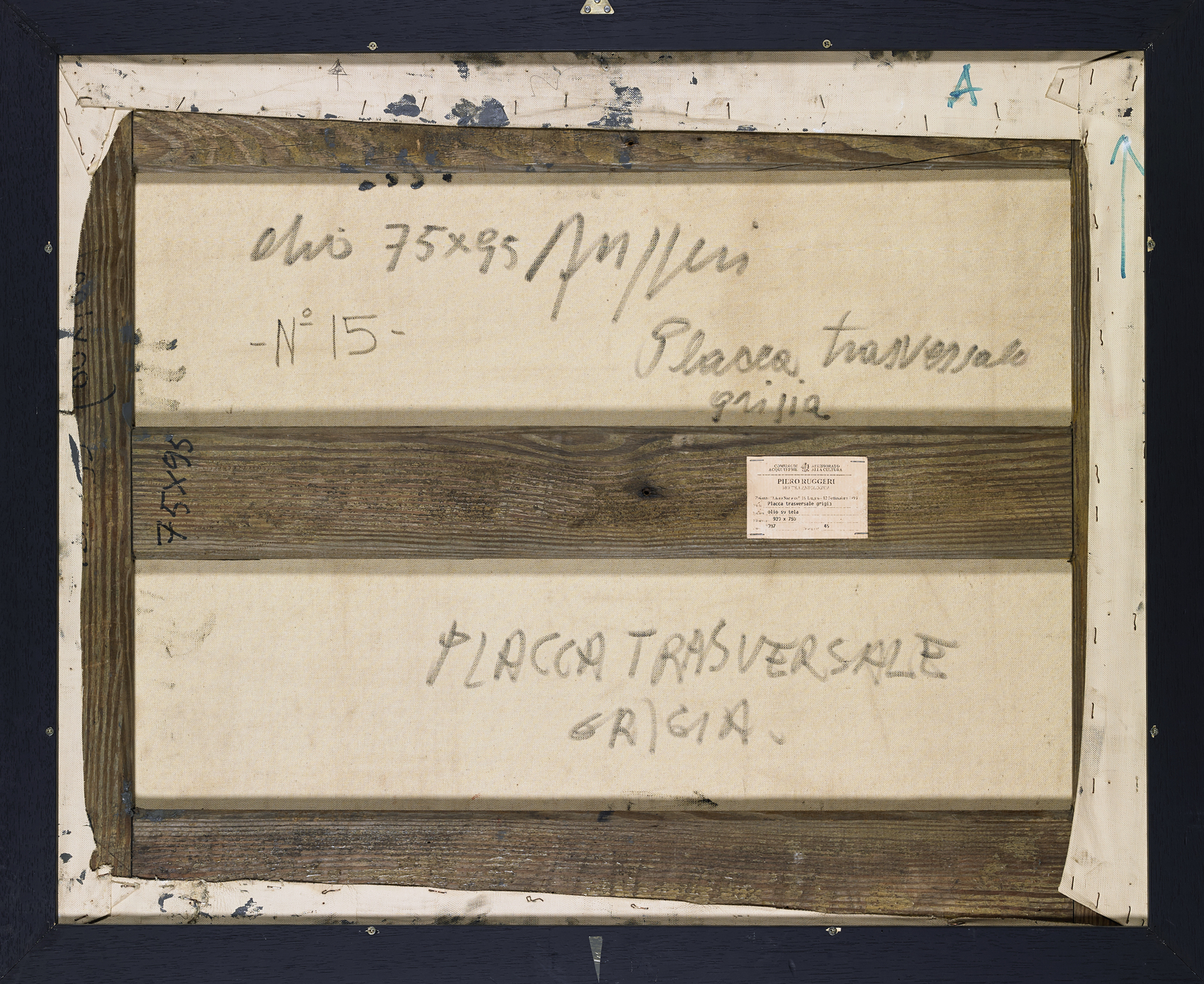 RUGGERI PIERO (1930 - 2009) Placca trasversale grigia. 1987. Olio su tela . Cm 93,00 x 75,00. Al retro titolo, firma e anno. Esposizione: Mostra Antologica Piero Ruggeri, 16 Luglio -12 Settembre 1993, Acqui Terme. Pubblicazione: Ruggeri a cura di Elisabetta Longari, Galleria Bottega d'Arte, Acqui Terme, Maggio - Giugno 1989, pag.18 -19. Cornice presente
