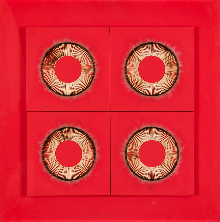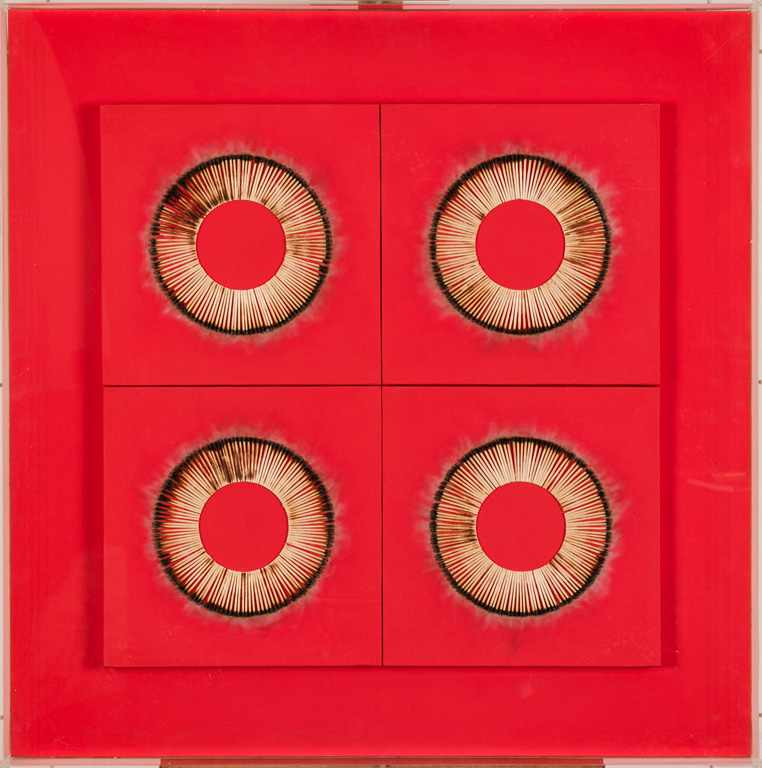 Fiammiferi bruciati su 4 tele cm 30x30 ciascuna applicate su tavola