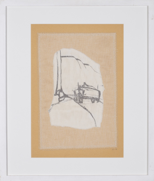 Tecnica mista composta da fotocopia in bianco e nero con sovrapposizione di garza bianca su cartoncino ocra e cucitura a filo bianco