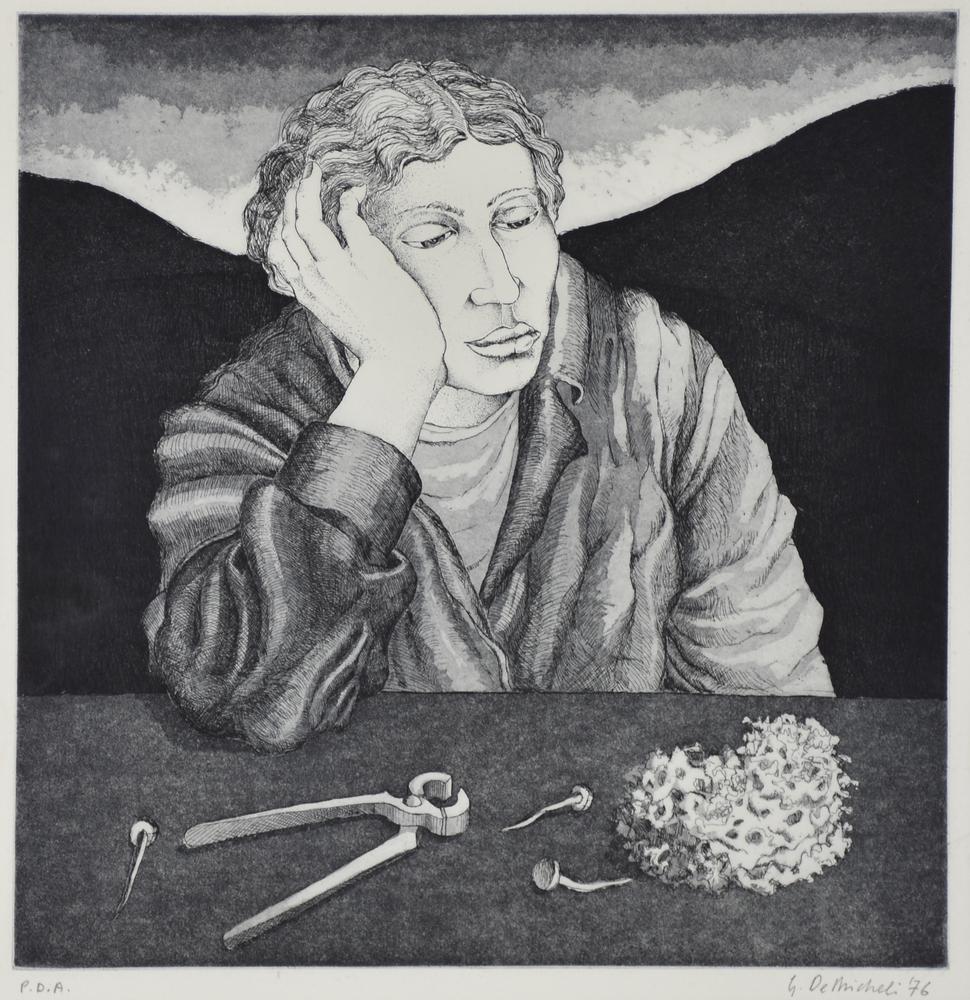 Gioxe De Micheli Senza titolo incisione su carta, cm 69x49 (lastra cm 34,5x34) esemplare prova d'autore sul fronte: firma e data eseguita nel 1976