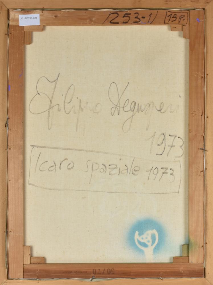 Filippo De Gasperi ICARO SPAZIALE 1973 tecnica mista su tela, cm 70x50 sul retro: firma, titolo e data eseguita nel 1973