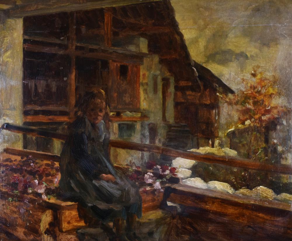Ignoto LA TERRAZZA SULLA BAITA olio su cartone, cm 46x38 sul fronte: sigla