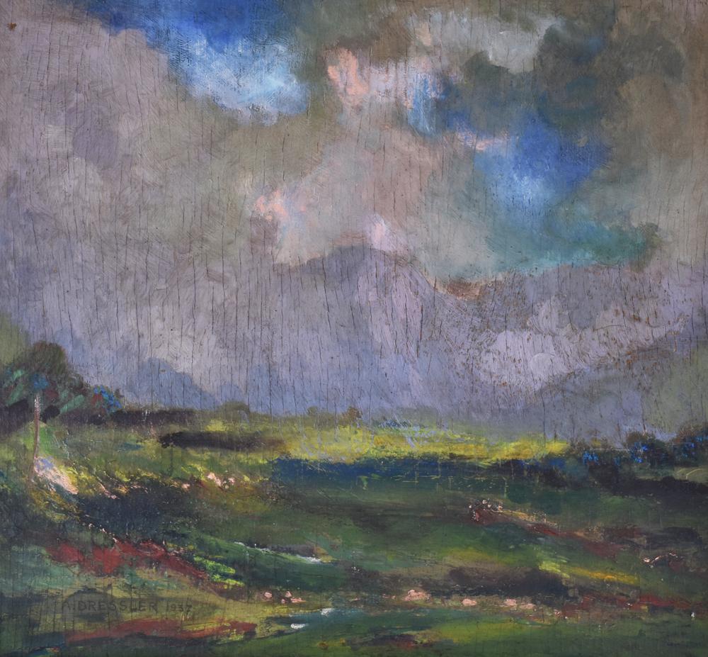 August Wilhelm Dressler LANDSCHAFT olio su tavola, cm 45,5x49,5 sul fronte: firma e data eseguito nel 1937