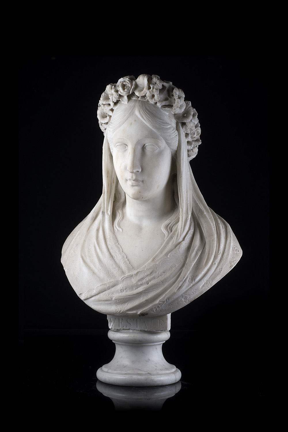 Busto di vestale in alabastro avvolta da panneggio con rose e stelle a rilievo e corona di fiori. Firmata GIO.LEGNANI. FECE 1843. Su base in marmo tornito (h. cm 56) (difetti)