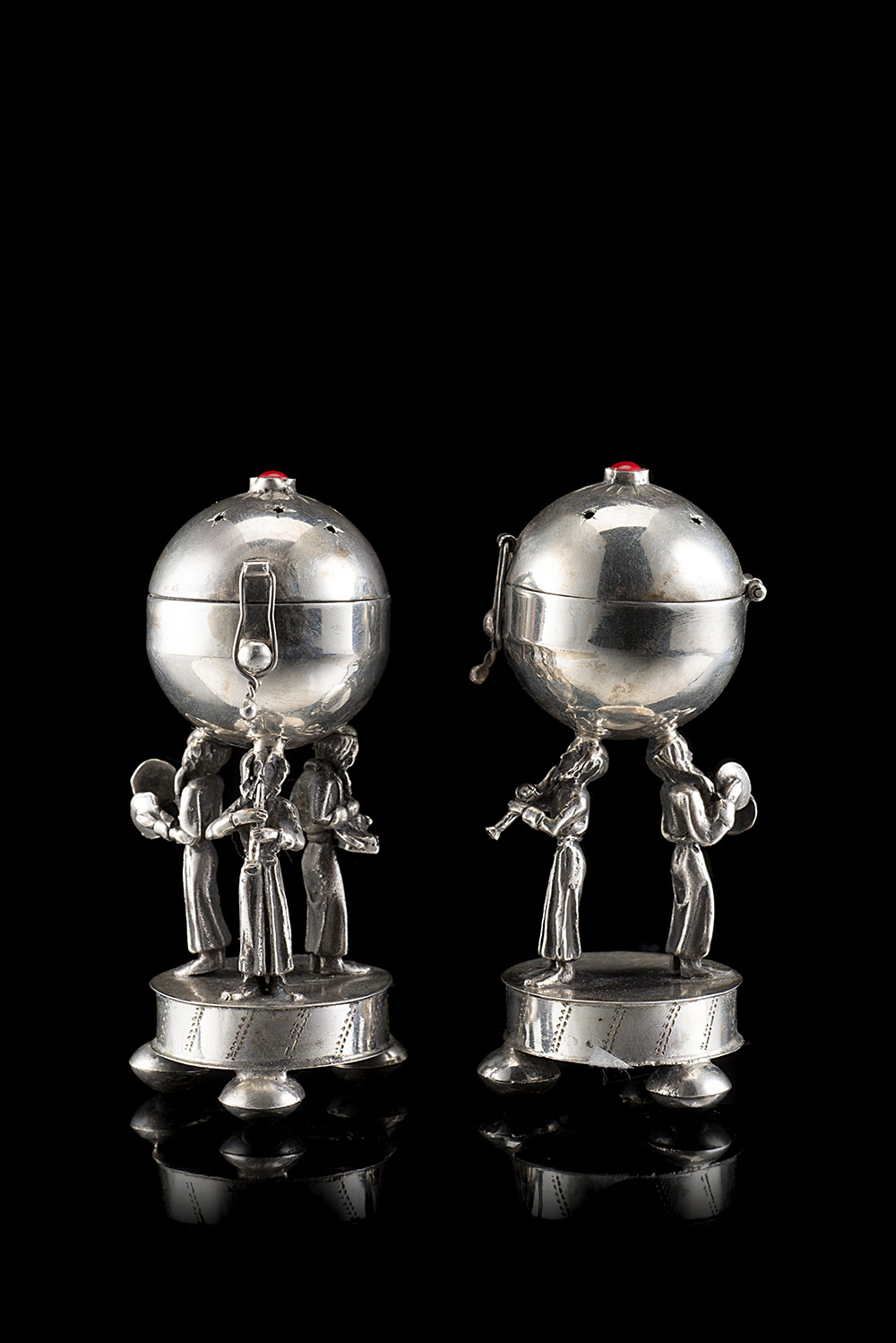 Coppia di besamin in argento sormontati da elementi in materiale vetroso, sorretti da figure di religiosi su basi circolari, poggianti su piedi a sfera. Punzoni russi datati 1894