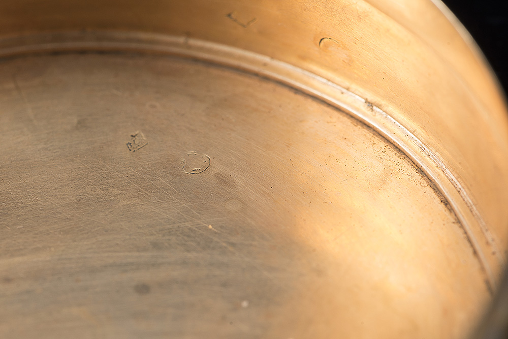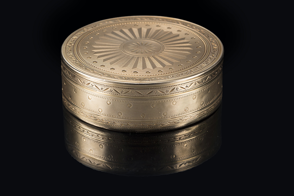 Tabacchiera tonda in oro cesellato a motivi stilizzati e volute fogliate nei bordi. Francia, tra il 1789 al 1809, punzone dell'orafo abraso (g 66) (d. cm 6)