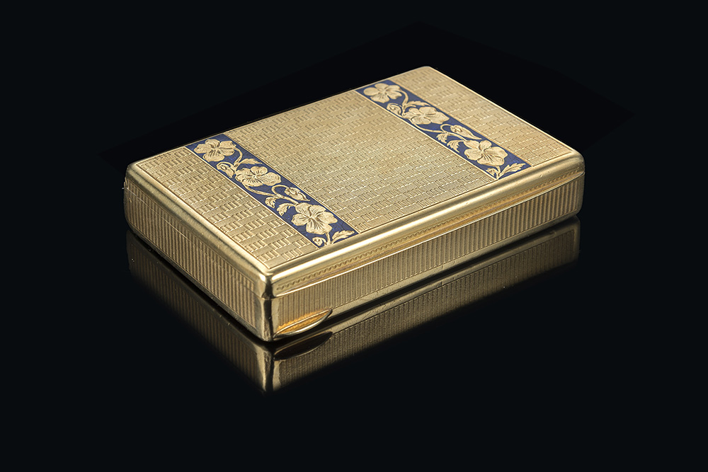 Tabacchiera rettangolare in oro "750" con corpo inciso a motivi vegetali e decorato sul coperchio a foglie e fiori su smalto blu (g 121) (cm 8x4)