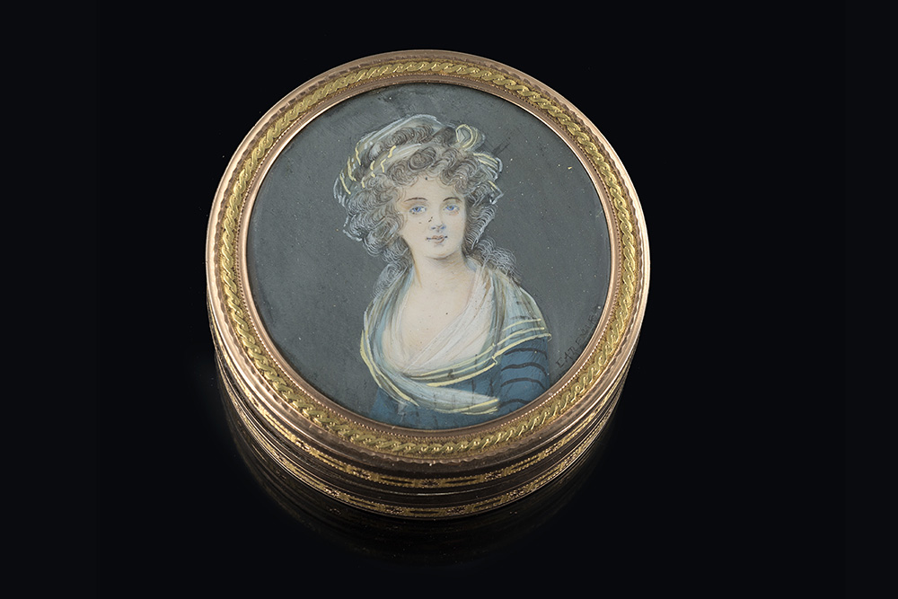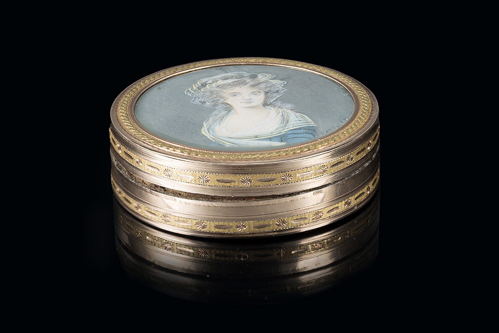 Tabacchiera in tartaruga rivestita in oro giallo e rosa cesellato a motivi concatenati e rosoni. Coperchio con miniatura firmata "Careme" raffigurante una dama in veste azzurra con veli bianchi. Prima metà secolo XIX. Apparentemente priva di marchi (g lordi 90) (d. cm 8) (difetti)