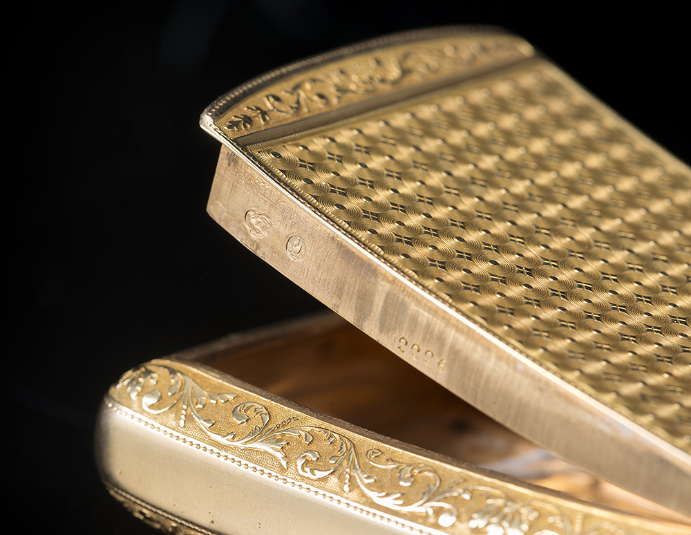 Tabacchiera di forma ricurva in oro cesellato sul bordo a volute fogliate e a motivi geometrici. Francia, dal 1809 al 1819 (g 72) (cm 8x5)