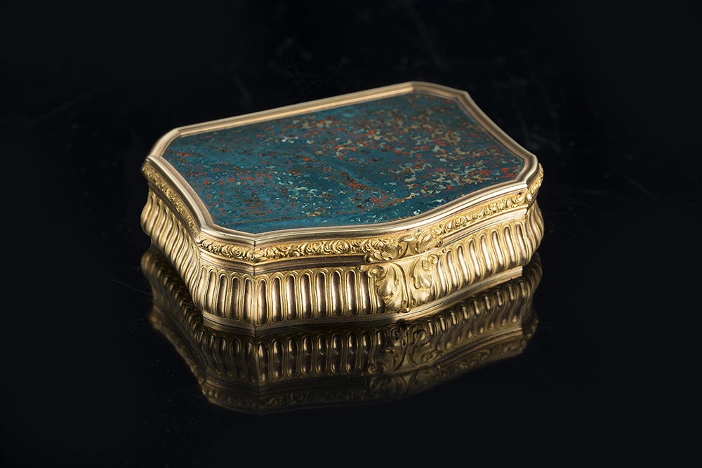 Tabacchiera di forma mossa in oro con bordo cesellato a motivi vegetali, scanalature e foglie. Coperchio e base in diaspro verde. Orafo Fossin & fils, Parigi, inizio secolo XIX (g 251) (cm 9,4x7,5)