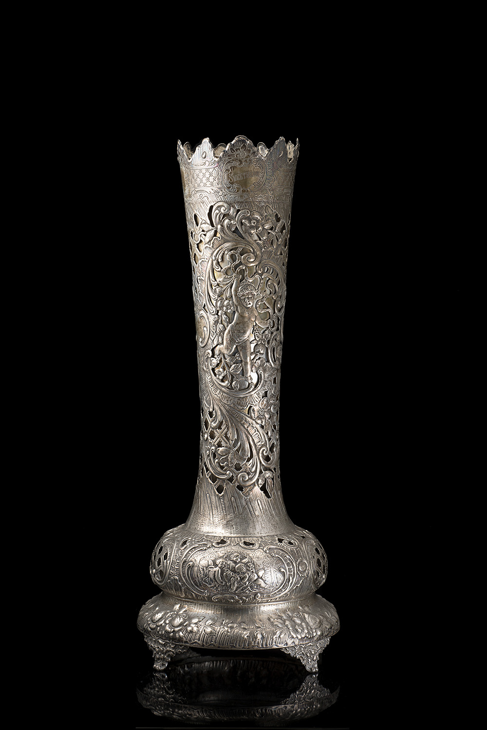Vaso portafiori in argento inciso e traforato, decorato a volute, foglie e putti. Base con riserve sbalzate ad amorini in paesaggi, sorretta da quattro piedini mossi. Punzoni non decifrati, inizio secolo XX (h. 52 cm) (g 1521 ca.) (lievi difetti)
