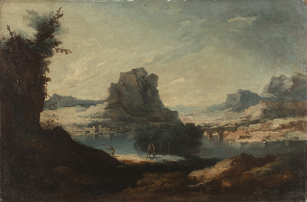 Scuola italiana del secolo XVIIIPaesaggio con figureOlio su tela cm 55x83,5In...
