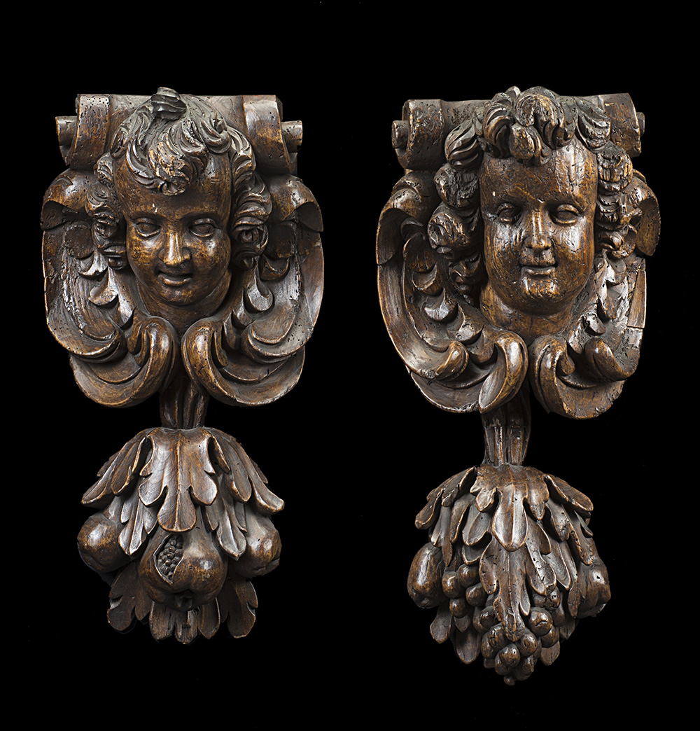 17th-century art "Putti" a pair of carved wooden caryatids (h. cm 54) (minor defects)