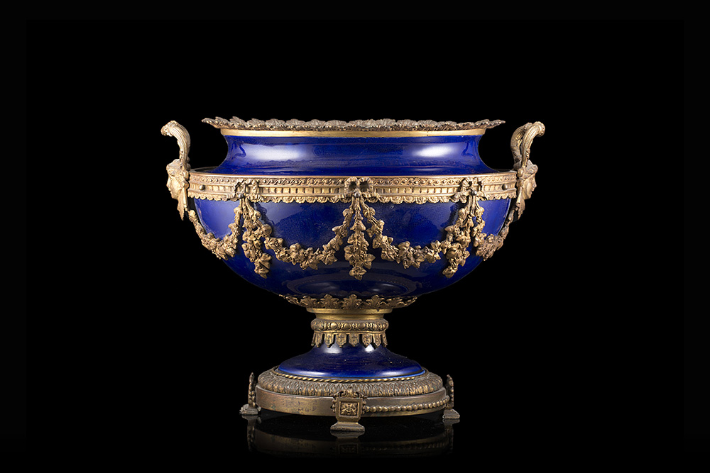 A large bronze-mounted blue ceramic vase (cm 47x48x29) (defects)