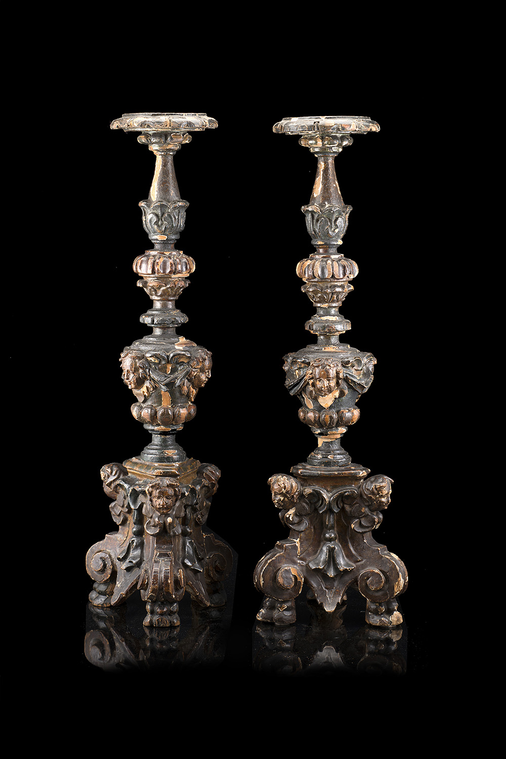 Coppia di portaceri in legno intagliato, laccato e parzialmente dorato. Fusto scolpito a festoni e putti, base tripode terminante a piedi ferini. Secolo XVIII (h. cm 66) (difetti e mancanze, montata a luce elettrica in epoca posteriore)