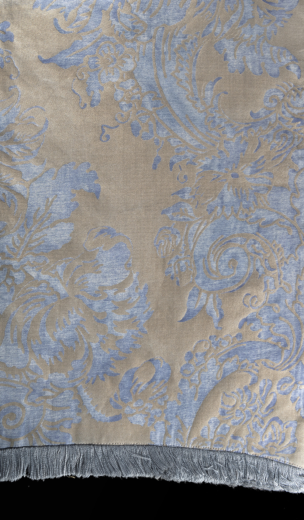Gruppo di quattro tessuti da arredamento in cotone stampato tramite collante, in segito spolverato di polvere d'argento su fondo azzurro carta da zucchero melange. Probabile manifattura Mariano Fortuny, Venezia (cm 131x45; cm 321x52; cm 317x120; cm 310x123) (difetti)