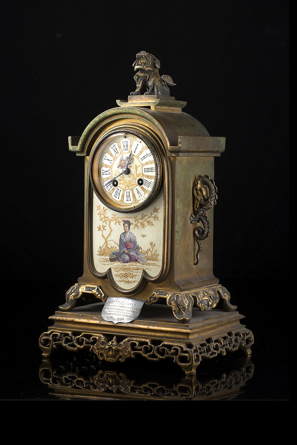 Pendola da tavolo in bronzo a forma di pagoda con decori orientali.Cartiglio esplicativo in argento datato 1894 in basso.