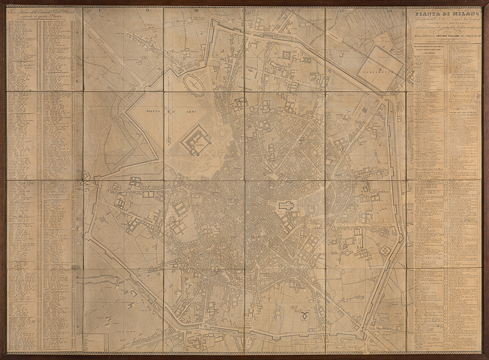Carta di Milano disegnata da Giovanni Brenna (1781-1850) e pubblicata da Antonio Vallardi nel 1860, composta da ventiquattro incisioni applicate su un'unica tela (cm 73,5x102,5). In cornice (difetti)