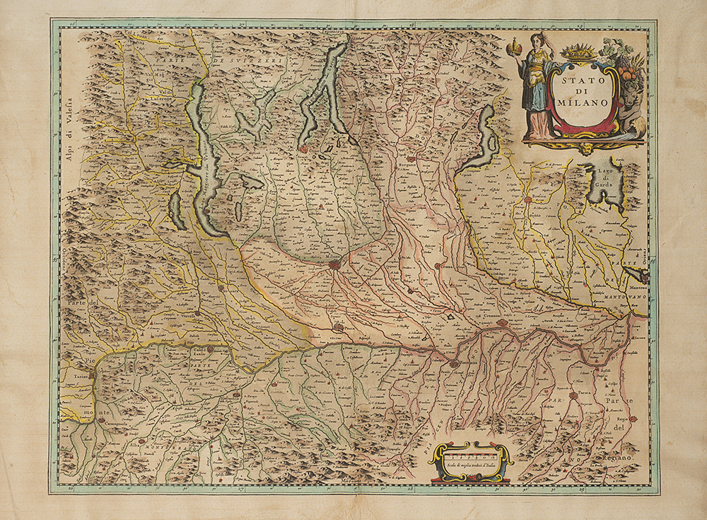 Incisione acquerellata raffigurante lo Stato di Milano, 1642 (cm 41,5x53). In cornice (difetti)