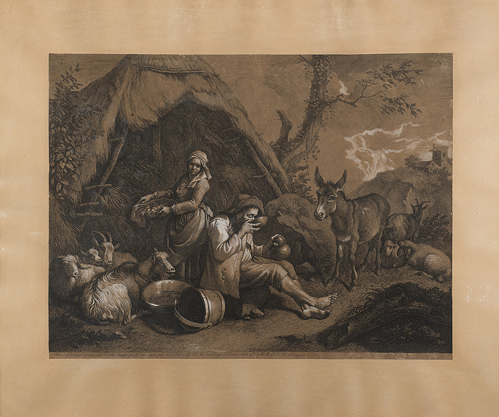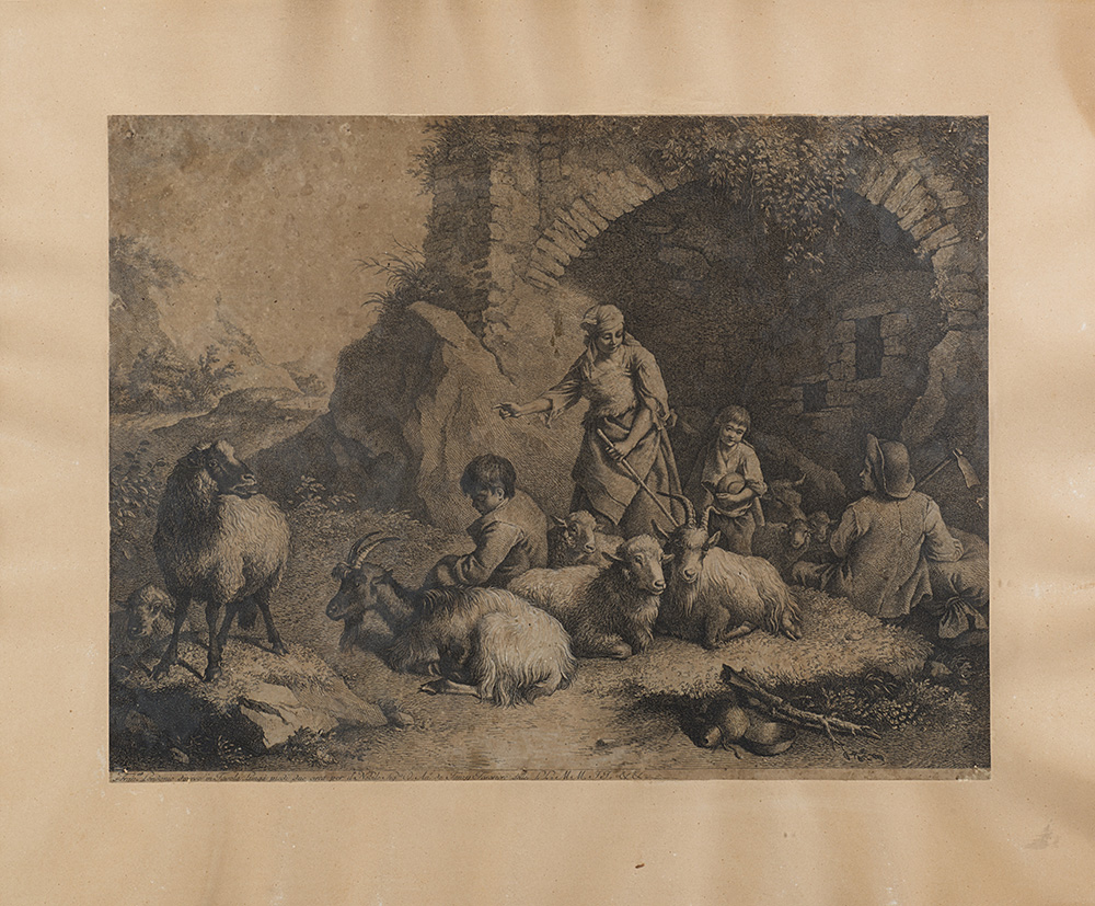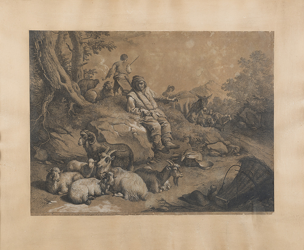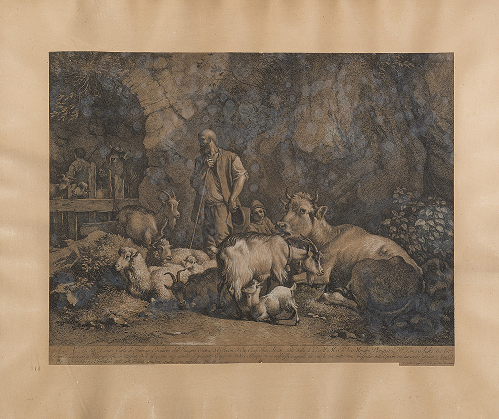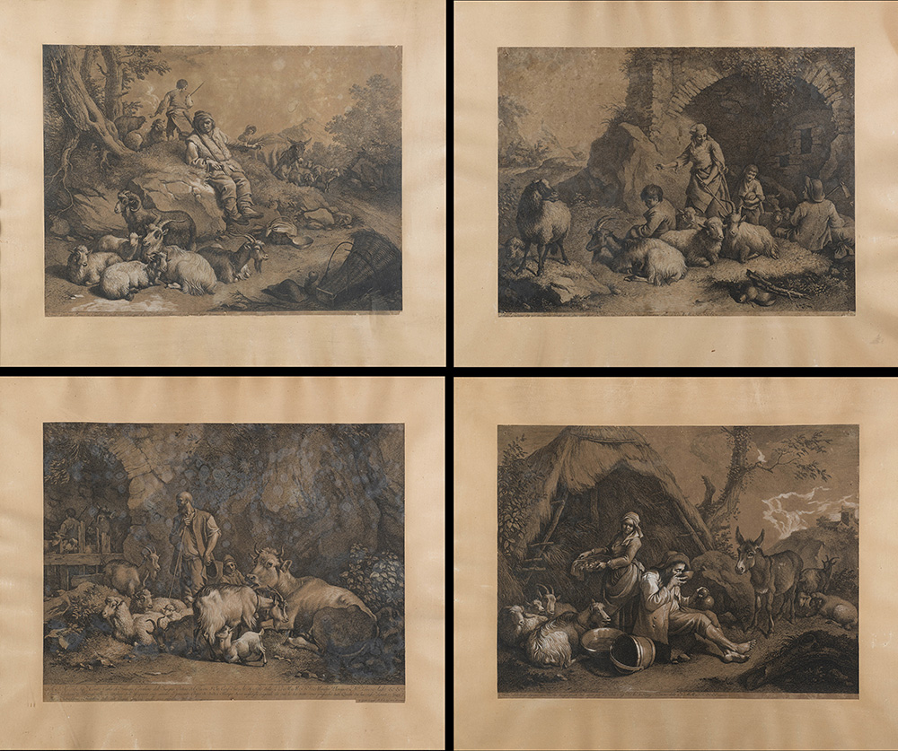 Quattro incisioni all'acquaforte "Soggetti pastorali", stampate su carta marrone e lumeggiate in biacca (cm 31x42 circa il foglio). In cornici (difetti)