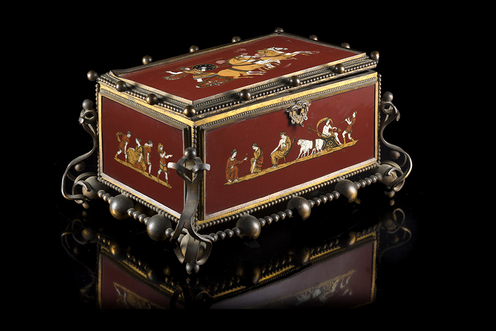 Manifattura del secolo XIX. Scatola portagioie in bronzo decorata da placche in ceramica a fondo rosso con scene classiche (cm 25x13x16) (difetti)