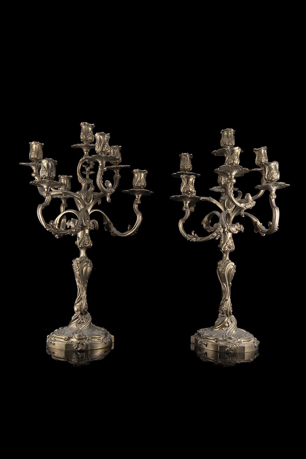 Coppia di candelieri in bronzo a sette fiamme con braccia mosse decorate a motivi vegetali, fusto a torciglione decorato a fiori. Secolo XIX (h. cm 50) (difetti)