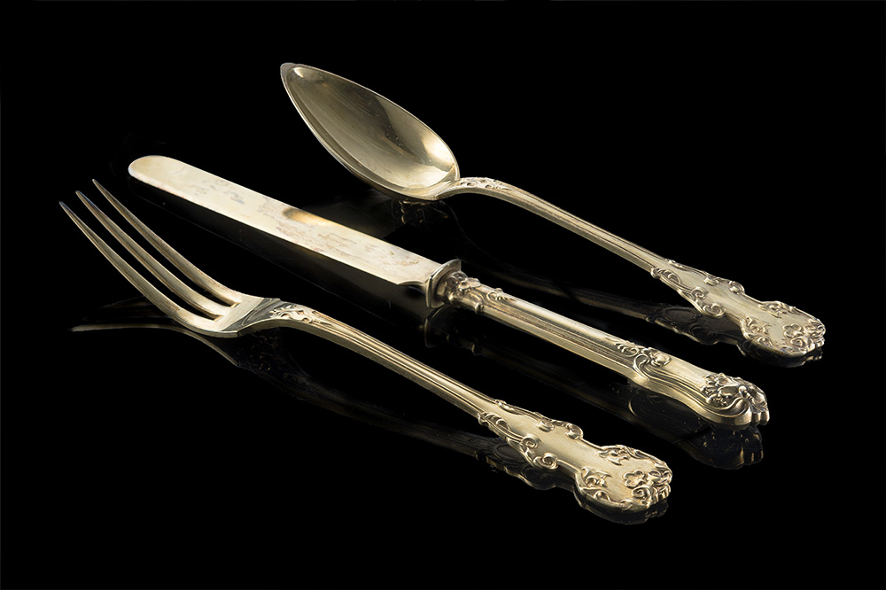Servizio di posate da dessert da dodici in vermeille composto da dodici forchette, dodici cucchiai e dodici coltelli. Argentiere "GS". Francia, seconda metà secolo XIX (g 1680 ca.)