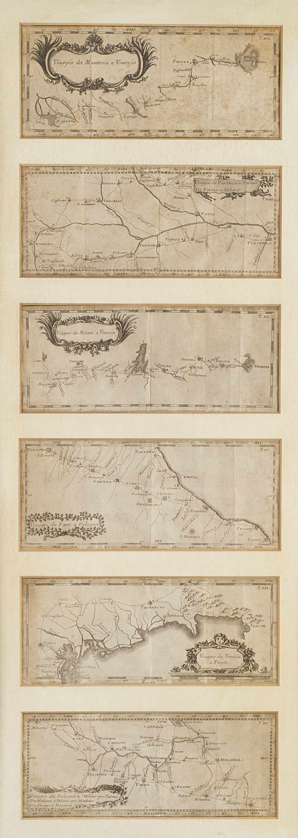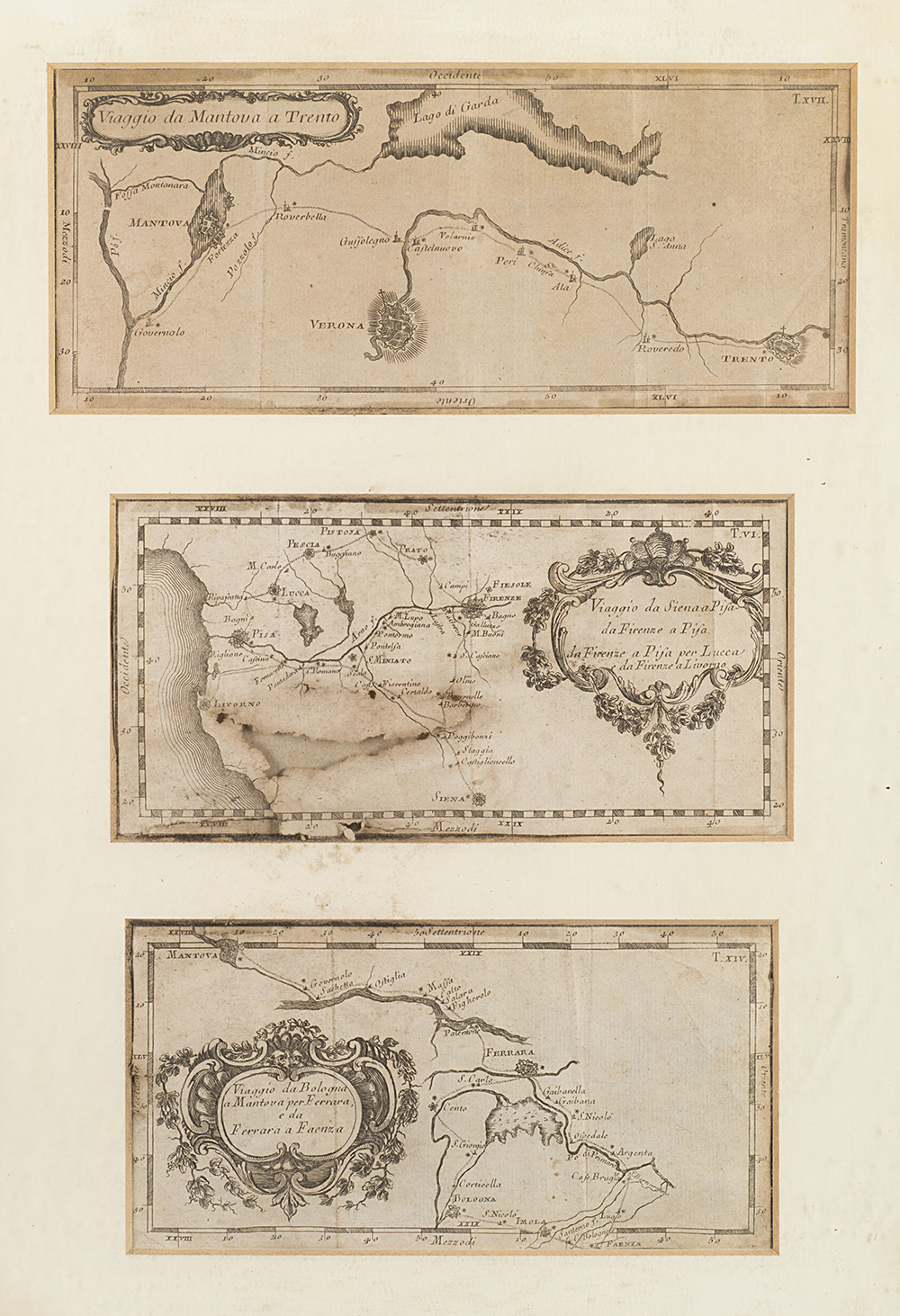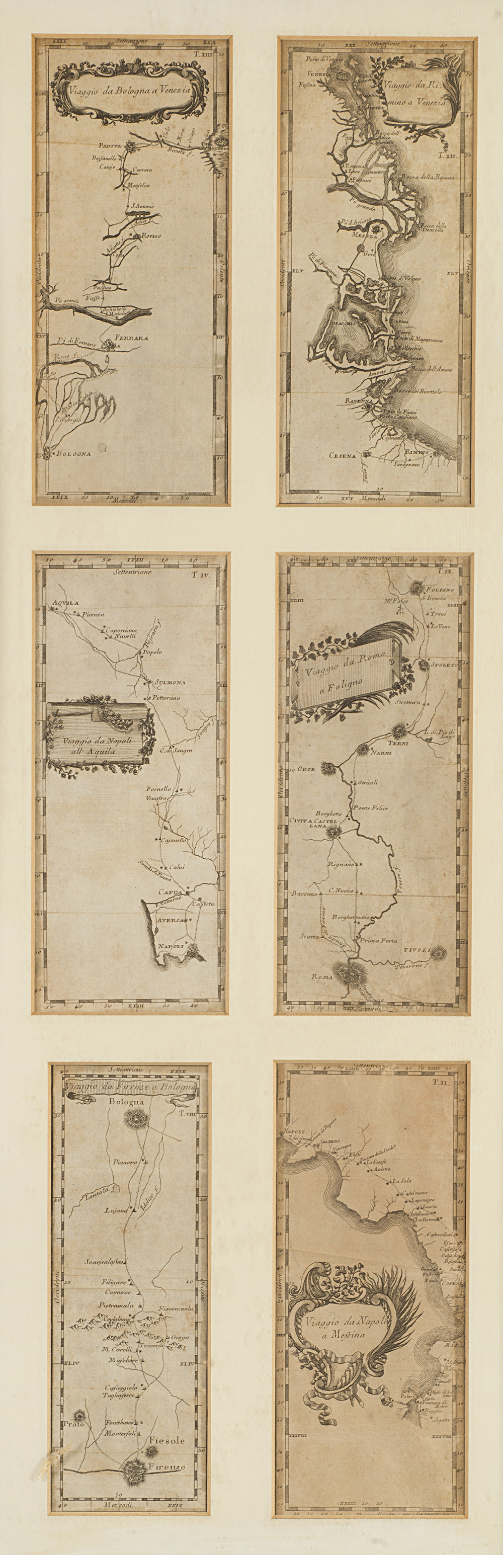 Gruppo di quindici incisioni di misure diverse tratte da "La vera guida per chi viaggia in Italia con la descrizione di tutti i viaggi..." Seconda metà del secolo XVIII