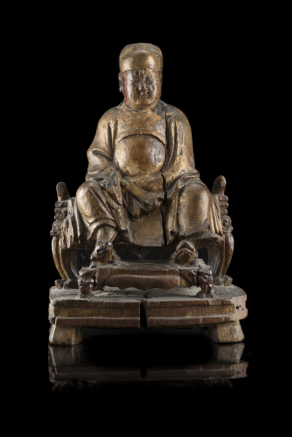 A gilt wood sculpture of an official sitting on a throne