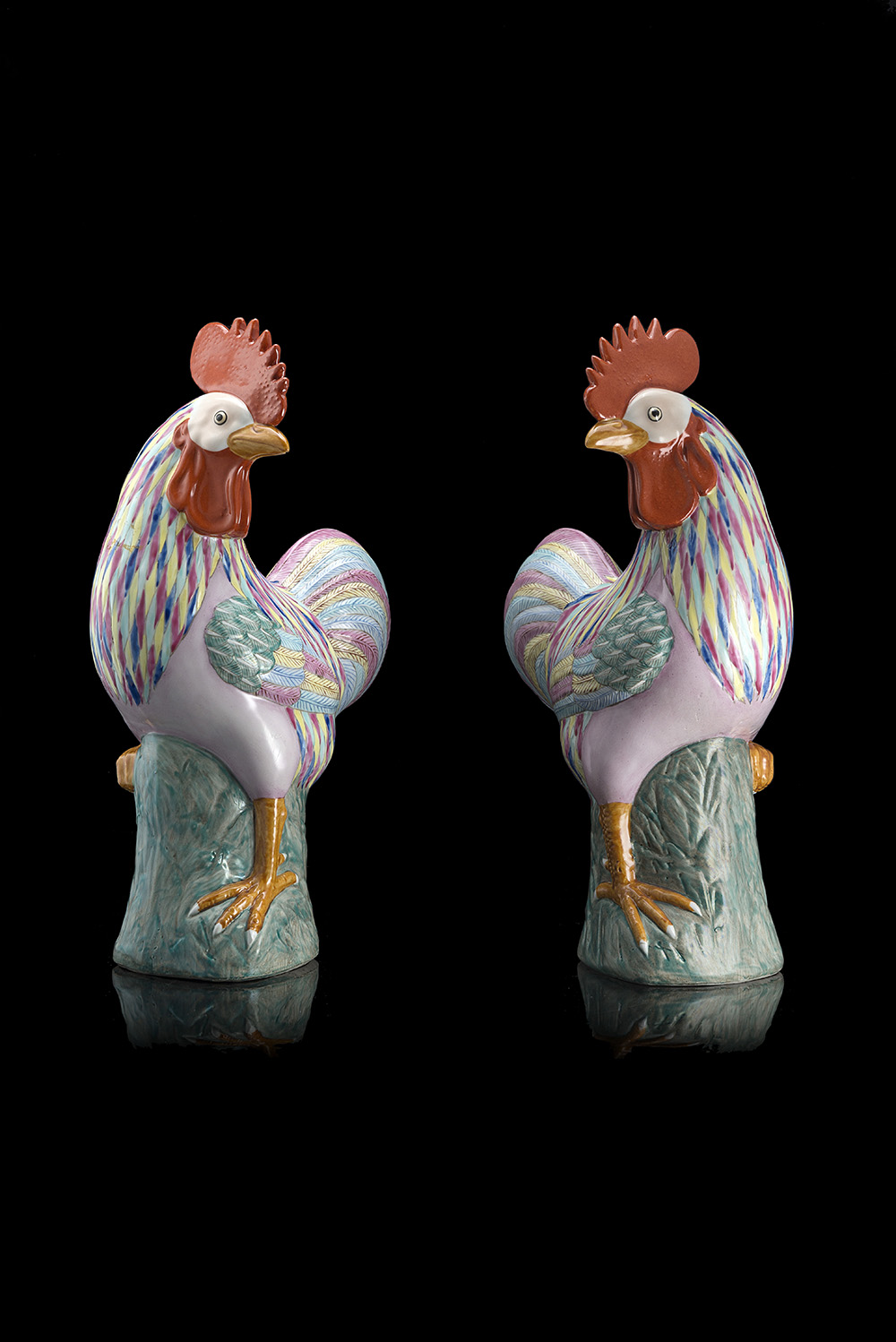 Coppia di galli in porcellana a smalti policromiCina, secolo XX(h. cm 40)-ENA...