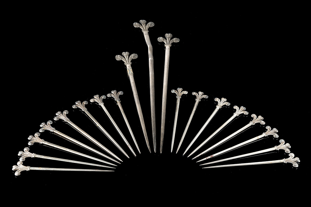 Gruppo di diciassette spilloni d'arrosto con prese in forma di piume e tre più grandi in argento. George W. Adams, Londra, circa 1855 (g 468 ca.) (uno rotto)