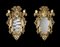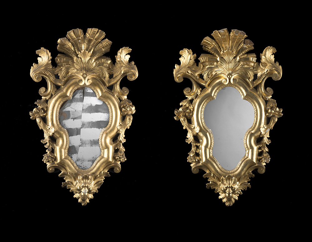 Coppia di specchiere in legno intagliato e dorato con cimasa e fregi laterali traforati e scolpiti a elementi fogliati, fiori e mascherone nella parte inferiore (cm 86x50) Napoli, inizio secolo XIX (difetti)